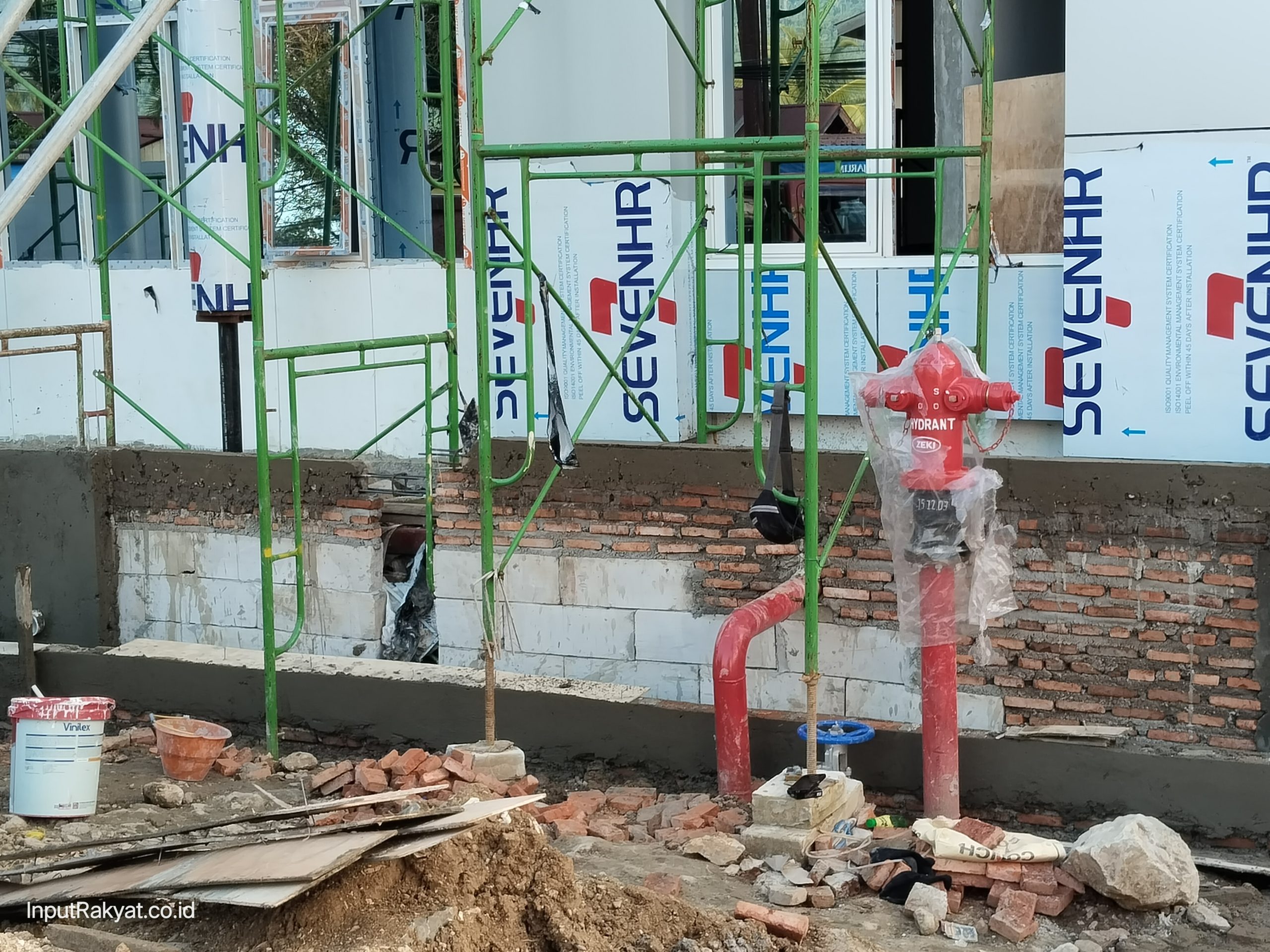 Selain itu, scaffolding masih terlihat terpasang di bagian depan dan samping bangunan. Pekerjaan saluran drainase juga masih dilakukan di area depan hingga samping kantor.