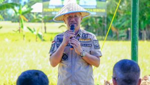 INPUTRAKYAT_JENEPONTO–Bupati Jeneponto Iksan Iskandar pastikan Stok beras aman terkendali, pada acara panen raya di kelurahan bontotangnga kecamatan tamalatea, Kamis. (09/03/2023)