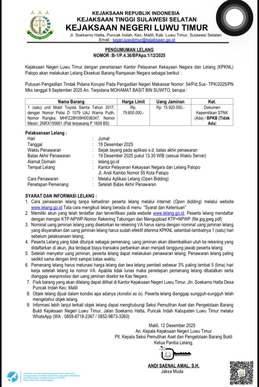 Barang lelang berupa satu unit mobil Toyota Sienta Tahun 2017 warna putih. Hal tersebut berdasarkan putusan pengafilan tindak pidana korupsi pada Pengadilan Negeri Makassar Nomor: 54/Pid.Sus- TPK/2025/PN Mks.